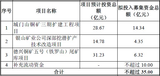 《议案》内容显示,公司拟非公开发行A股及H股。其中,非公开发行A股的股票的数量不超过298,380,221股,发行对象为包括本公司控股股东江西铜业集团公司在内的不超过10名特定对象, 其中,江铜集团拟认购不低于本次非公开发行A股股票数量的10%。募集资金总额不超过人民币35亿元,在扣除相关发行费用后,拟用于城门山铜矿三期扩建工程项目、银山矿业公司深部挖潜扩产技术改造项目及德兴铜矿五号(铁罗山)尾矿库项目的建设,剩余金额补充流动资金。