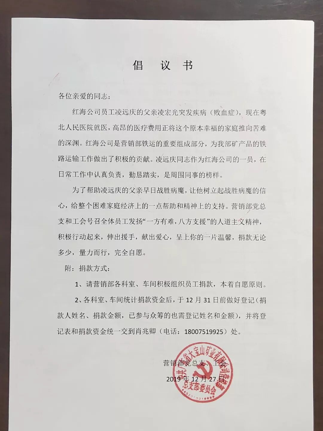 群众冷暖,时刻记在党员的心头。近日,一位困难职工的病情,让营销部全体党员干部迅速行动起来,捐献爱心。“天有不测风云,人有旦夕祸福”,2019年12月15日,原本在家休息的凌宏光突感不适、直接倒地,随后被家人发现、紧急送往粤北人民医院抢救;经过医生确诊,查出其患有严重败血症,已引起各器官衰竭及并发症等,立刻送入医院 ICU监护室中,至今未脱离生命危险。凌宏光的儿子凌远庆是红海人力资源集团驻大宝山项目组的一名普通员工,平日里一直任劳任怨、勤勤恳恳,为营销部铁运工作付出了辛劳汗水。可如今,一家子重担瞬间落在他的肩上,白天要忙工作,晚上要去照顾父亲,高额的医疗费用瞬间掏空了全家的积蓄,来回奔忙更是让他愁眉不展、心力交瘁。获悉此情况后,营销部党总支即刻与部门工会行动起来,积极和红海集团驻大宝山项目组联络,第一时间发出“献爱心”活动倡议书,号召党总支全体党员干部,带领职工群众一起为凌宏光伸出援手,踊跃捐款,把党员的一面旗帜坚定插在“帮扶困难群众”的任务上。