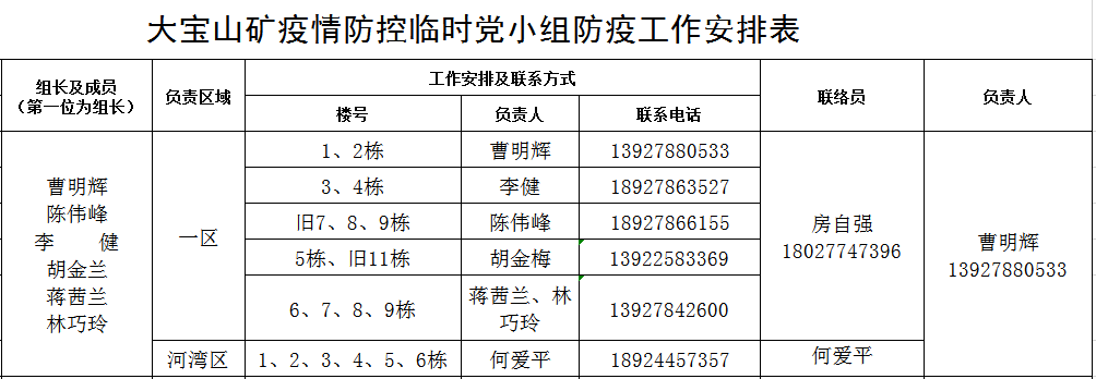 此前,公司党委已经对每个疫情防控临时党小组防疫工作做了详细安排,在生活区内每一栋居民楼都设立了负责人,公布了负责人联系方式,方便及时了解最新情况。