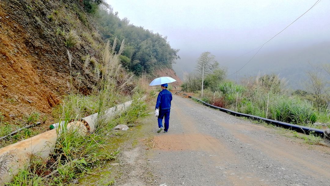 防疫期间,凡洞区域常常下雨,他们就会更加繁忙。每天巡查的工作力度会随着汛期的到来加大,不仅次数增多,而且巡查的要点更细、更广。若是泥沙、树枝等杂物堵塞了坝体排水的沟、渠,他们就冒着雨进行及时清理,确保沟、渠排水的畅通。在尾矿库的4#公路,每年因雨水冲击都会发生或大或小的塌方现象,所以每次一下雨,护坝工就会反复巡查,一旦发现有塌方现象,就立即拉上警戒线,防止过往车辆和人员进入危险区域。