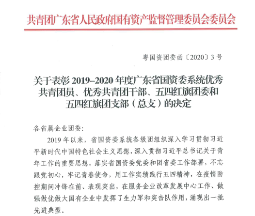 公司团委荣获共青团广东省人民政府国有资产监督管理委员会委员会2019——2020年度“五四红旗团委”荣誉称号;