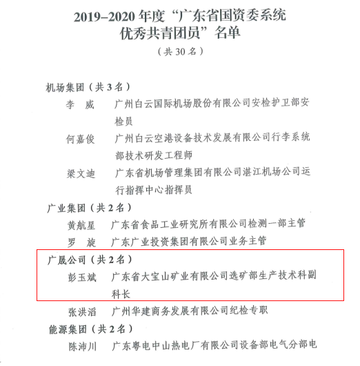 彭玉斌同志荣获共青团广东省人民政府国有资产监督管理委员会委员会2019——2020年度“优秀共青团员”荣誉称号。
