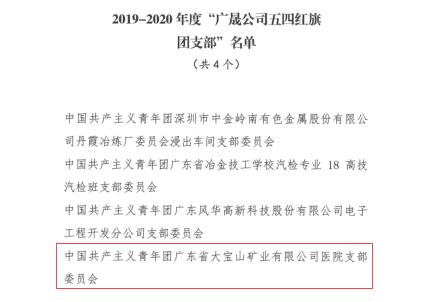 大宝山医院团支部荣获共青团广东省广晟资产经营有限公司委员会2019——2020年度“五四红旗团支部”荣誉称号;