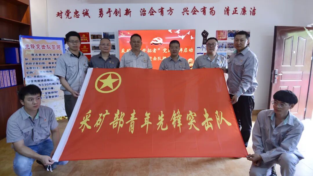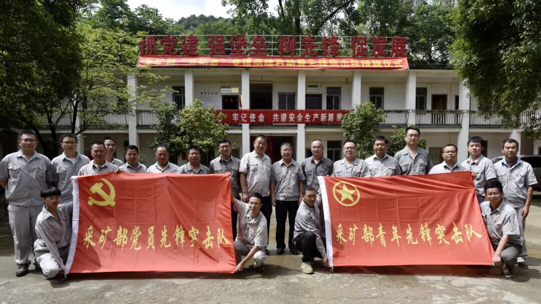 李中平、陈建澄为采矿部党支部“党员先锋突击队”授旗并合影