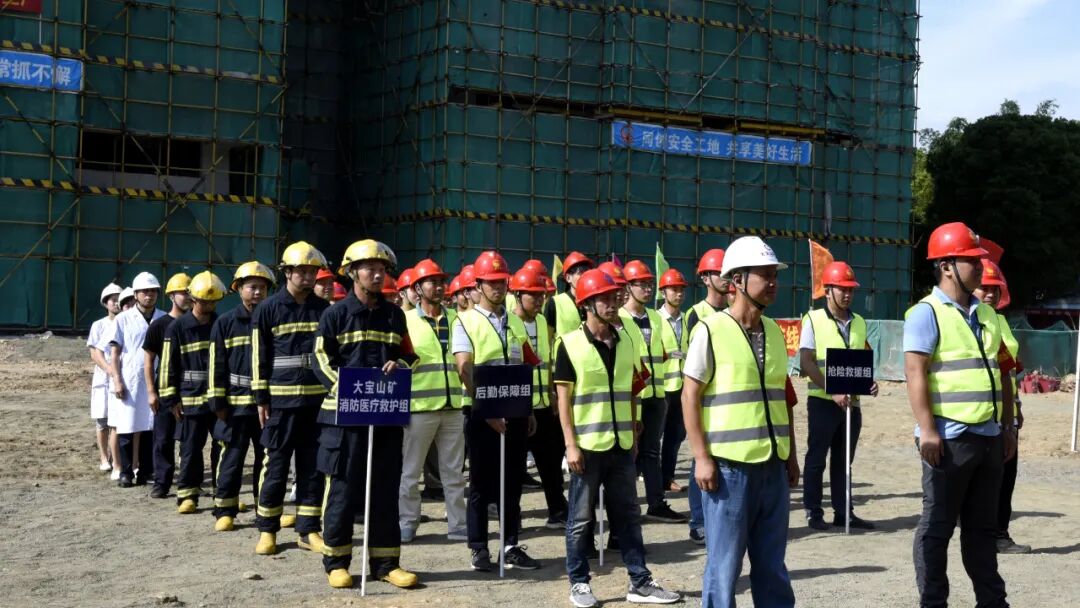 演练成立了以赵晖为总指挥的演练实施小组,设置抢险救援组、综合协调组、警戒疏导组、后勤保障组等四支参演工作小组,演练模拟地点设在公司棚户区改造项目现场4#楼及其周边,分三个场景,响应类别为三级响应二级预警。来自公司大宝山医院的医护人员与矿地资源部消防队员积极协助、参与其中。