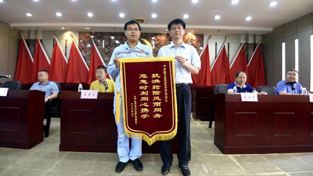 为感谢宏大爆破大宝山项目部在“6.9”抗洪抢险中主动伸出援手,与宝山人风雨同舟,共同开展抢险救灾工作,公司党委决定,赠予宏大爆破大宝山项目部“抗洪抢险风雨同舟 危急时刻同心携手”锦旗。
