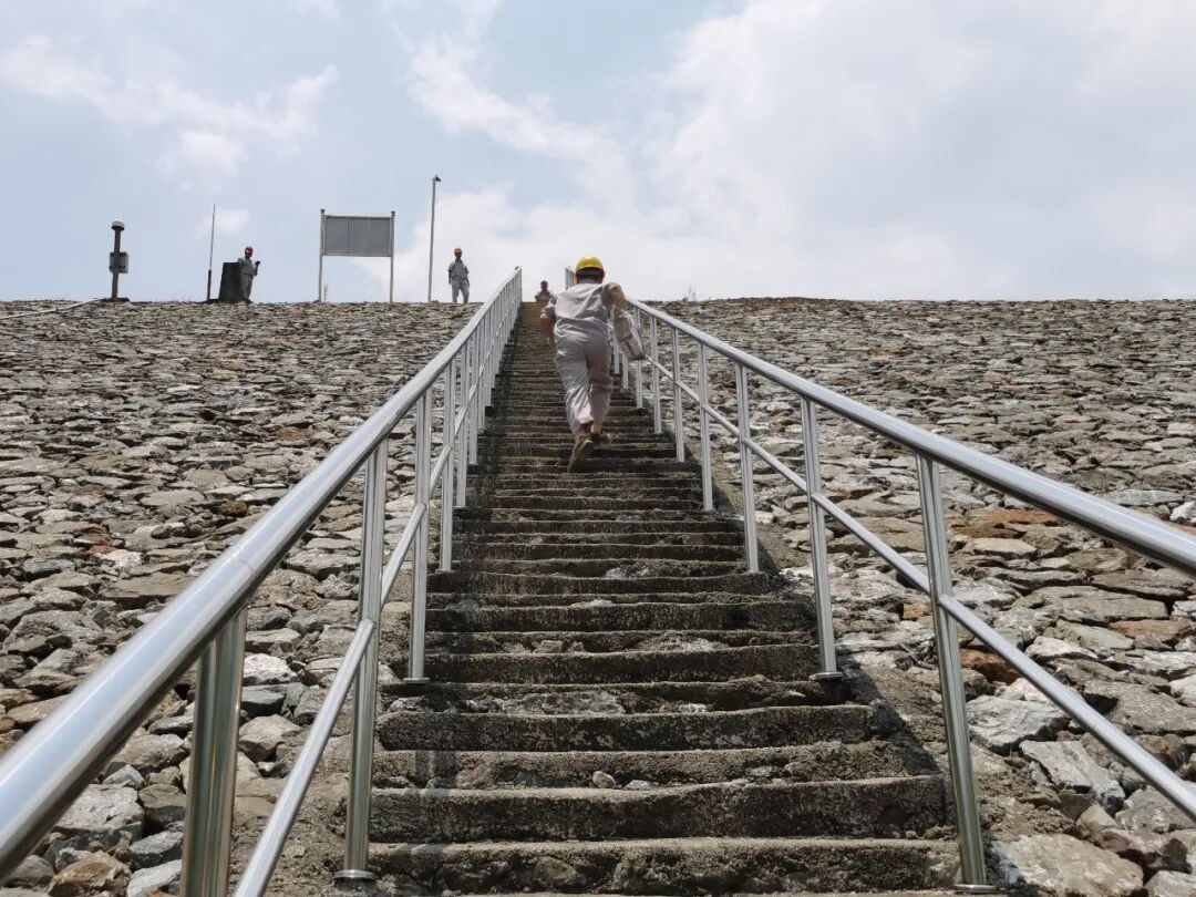最后,全体同志在尾矿库一号坝开展了“步步高升”抢险趣味活动,参赛人员分成2组接力,将“尾矿库应急救援物资”运至尾矿库坝顶。虽然烈日炎炎,坝梯陡峭,但丝毫不减大家比赛的热情与取胜的决心,他们铆足了劲头向上攀登。