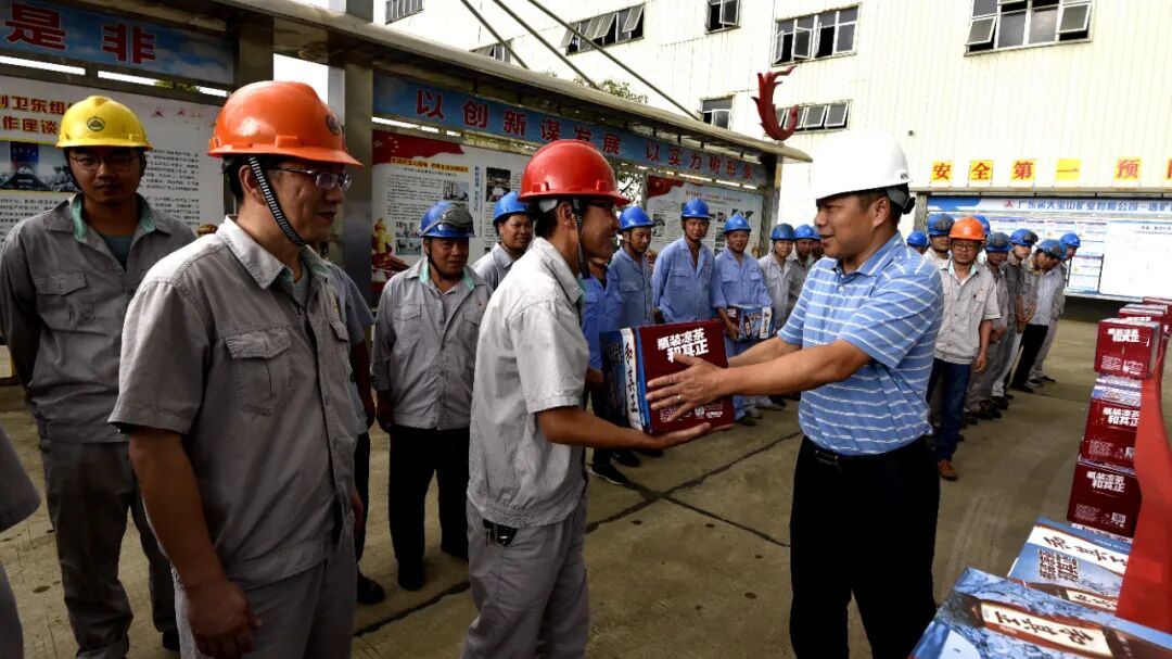 在公司领导巫建平、李中平和工会负责人的陪同下,刘聪一行顶着似火骄阳,驱车前往选矿部、采矿部等生产单位,面对面与职工们亲切交谈,询问他们在日常工作与生活上的具体情况,将一箱箱清凉饮品递到他们的手上,并代表组织对大家所作出的突出贡献表示感谢。刘聪指出,今年以来,大宝山矿广大干部职工在公司党委强有力的领导下,克服疫情冲击、6·9洪灾侵袭等困难,甘于奉献、攻坚克难、爬坡越坎,实现稳产高产,生产指标屡破记录,充分体现了宝山人的坚韧意志与责任担当。