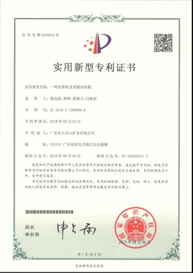 胶带机运输装置已在去年获得国家发明专利授权。