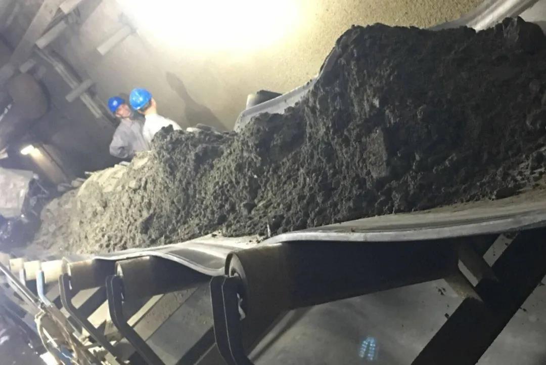 ♦组织人员对积矿进行清理,清理出来的矿粉堆满胶带。