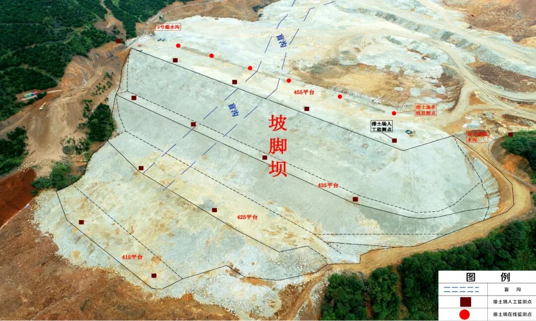 2017年7月14日,330万t/a铜硫采矿工程安全设施设计通过应急管理部(原安监总局)评审,同年10月16日,应急管理部批文建设,基建3年。基建期间,公司克服各种不利因素的影响,狠抓安全项目建设,于2020年8月中旬基本完成安全项目建设。其中,453坡脚坝建设是该工程安全设施中的重要组成部分,自建设开工以来,一度受到诸多客观因素影响,工程进度缓慢。自2019年下半年开始,尤其是公司新班子成立后,公司领导高度重视,党委书记、执行董事、总经理巫建平要求,所有参与部门必须全力以赴加快进度,确保按时完成任务;副总经理周永孝靠前指挥、亲自部署;安全管理部、生产部、采矿部将453坡脚坝建设作为头号工程开展攻坚,列出建设清单、定责任单位、倒排时间表,确保了坡脚坝建设如期完成。2020年8月18日开始试运行至今,边坡安全监测、运输道路、排土场坡脚坝、供电、截排水以及安全硬件等设施基本达到要求,采场生产顺畅,满足安全生产要求。