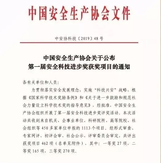科技兴安 硕果累累——公司参与完成的多个安全科技项目荣获中安协第一届安全科技进步奖