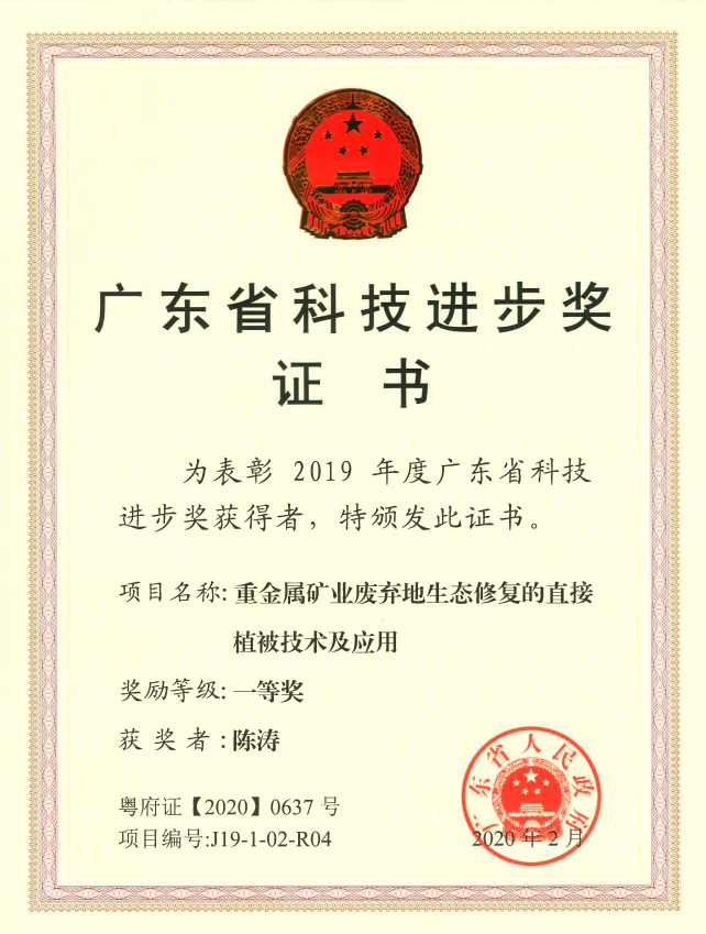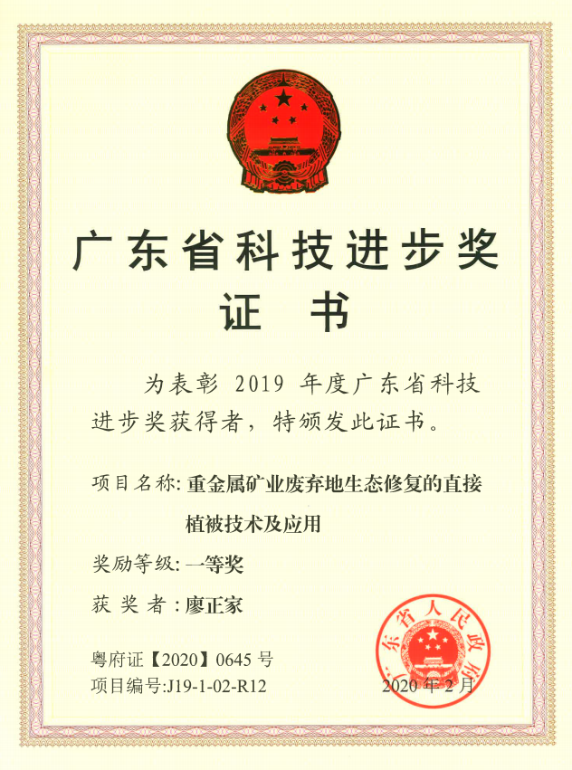 广东省科学技术奖:是为贯彻尊重知识、尊重人才的方针,鼓励自主创新,鼓励攀登科学技术高峰;加强知识产权保护,加强科学研究、技术开发与经济建设、社会发展的结合;促进科学技术成果商品化和产业化,促进“科教兴粤”和“可持续发展”战略的实施。授予条件:技术创新性突出,技术指标先进;经科技成果转化应用,经济社会效益、生态环境效益或市场应用价值显著;在推动行业科技进步、促进区域协调可持续发展等方面有重大贡献。项目技术特点:重金属矿业废弃地生态修复的直接植被技术是不改变矿业废弃地的地形与土壤结构,无需客土,柔性改良土壤结构,通过调控微生物群与控制产酸的微生物类群,重建一个人工或半人工的生态系统,用以稳定重金属,降低重金属迁移,实现源头控制重金属污染。项目技术优势:该技术操作简单、经济有效,可同时解决地质灾害、重金属环境污染、生态恢复三大问题,约为传统修复技术成本的一半,适用于包括排士场、尾矿库、采坑边坡、污染退化土地等。